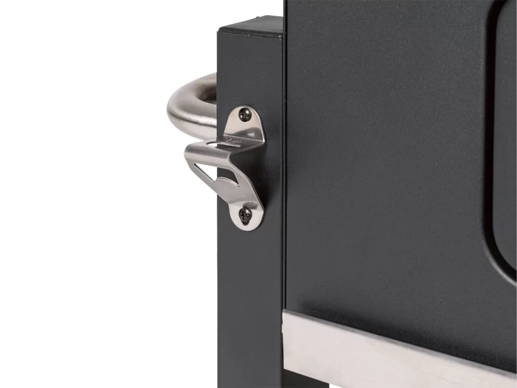 La barbacoa Toronto Click también cuenta con una bandeja lateral plegable que incluye 4 ganchos para los cubiertos, lo que te brinda un espacio conveniente para colocar tus utensilios de cocina mientras cocinas. Además, cuenta con un abrebotellas integrado, para que puedas disfrutar de tus bebidas favoritas mientras disfrutas de una deliciosa barbacoa al aire libre.